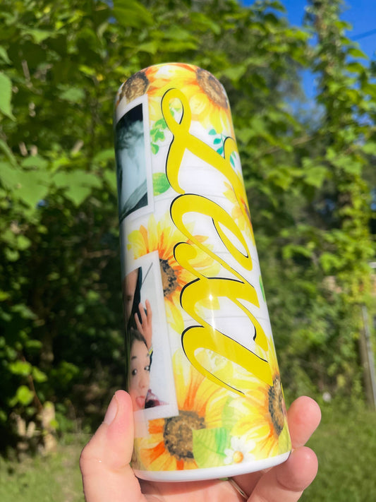 - These cups are created using a process called Sublimation- using heat and pressure to transfer ink onto the surface- this gives me the ability to create full color and HD designs.